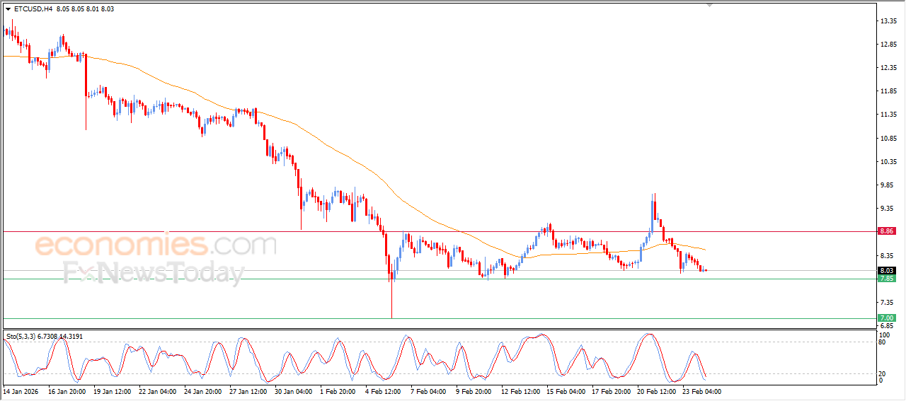 イーサリアムクラシック(ETCUSD)の価格は、50日移動平均線を下回って推移したことによる下押し圧力が継続する中、直近の日中取引で下落を記録しました。これは、主要な短期的な弱気トレンドの安定性と優位性を強化し、周囲の下降圧力を強めています。これは、売られ過ぎの水準に達しているにもかかわらず、ストキャスティクス指標からネガティブなシグナルが出ていることと並行して起きています。
