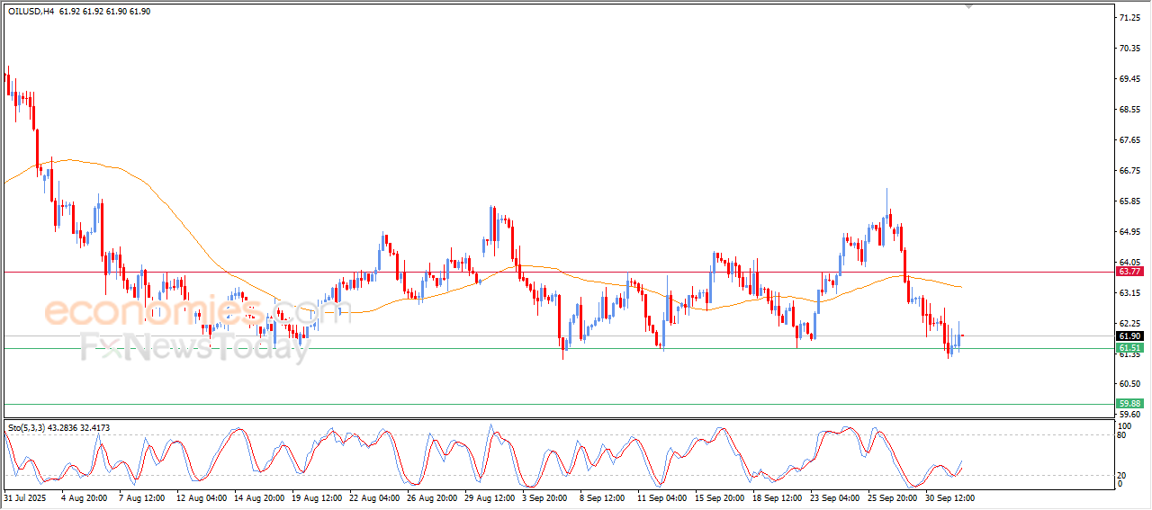 原油価格は、売られ過ぎレベルに達した後、相対力指標に肯定的なシグナルが現れたことに加え、重要なサポートレベルである61.50ドルの安定性の影響を受け、直近の日中取引で上昇した。これにより、価格は以前の損失を取り戻し、この売られ過ぎ状態を解消しようとした。