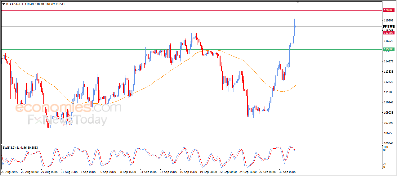 ビットコイン価格(BTCUSD)は直近の日中取引で急騰し、以前の目標であった117,800ドルという重要な抵抗線を突破しました。このパフォーマンスは、強力な短期的な強気波が優勢である中で達成されました。価格が50期間単純移動平均線を上回って推移するなど、継続的な上昇モメンタムに支えられており、現在の上昇トレンドの強さがさらに強化されています。