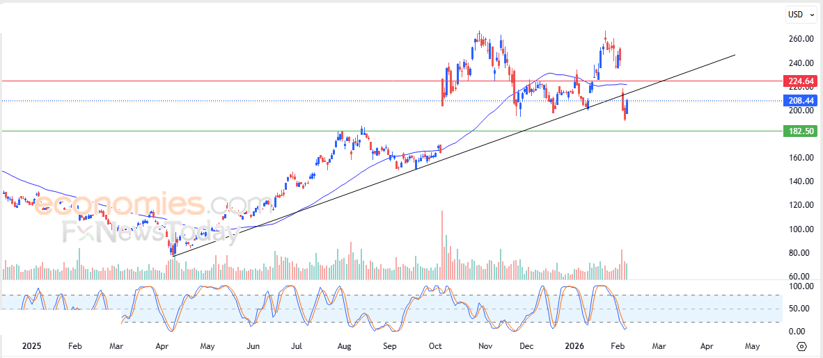 したがって、224.65ドルの抵抗レベルが維持される限り、今後の取引で株価は下落し、主要サポートである182.50ドルを目標とすると予想されます。